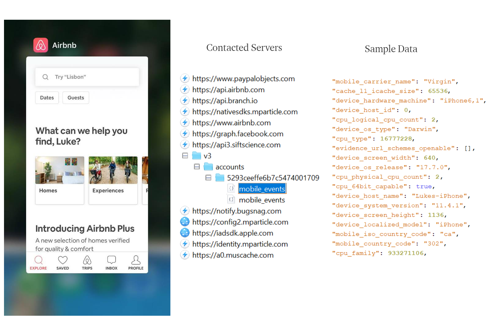 Airbnb's iOS application makes use of four data collection tools: Sift Science, Bugsnag, mParticle, and Facebook's Graph API. The size, granularity, and underlying reason behind collecting the device data differs for each tool. The following focuses on Sift Science as it collects the largest and most detailed data from the device.