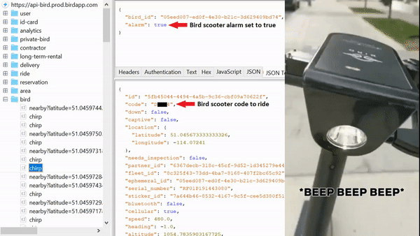 Replaying this request with the parameter set to true will cause the Bird alarm to go off, and is designed to assist users in locating a nearby scooters. A subscriber of The App Analyst assisted by going to a location in Calgary to record as alarms were programatically triggered through the Bird API. Using this API one could imagine that entire cities of Bird scooters could be set off at once.