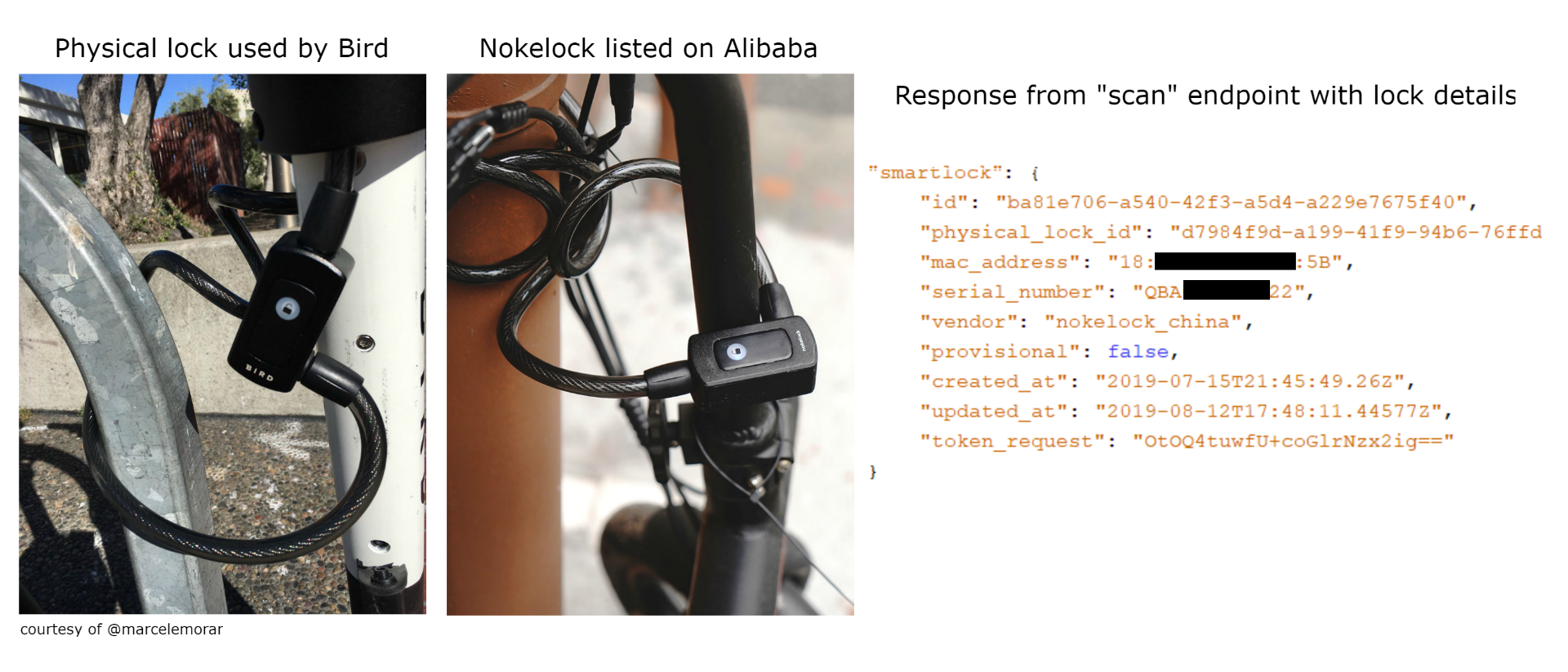 Another interesting note is that the serial number is provided in the response, in other models of locks produced by Nokelock this serial number is used to gain ownership of the lock from the Nokelock app. Revealing this serial number could potentially allow for the mass takeover of physical locks used by Bird to secure their scooters.
