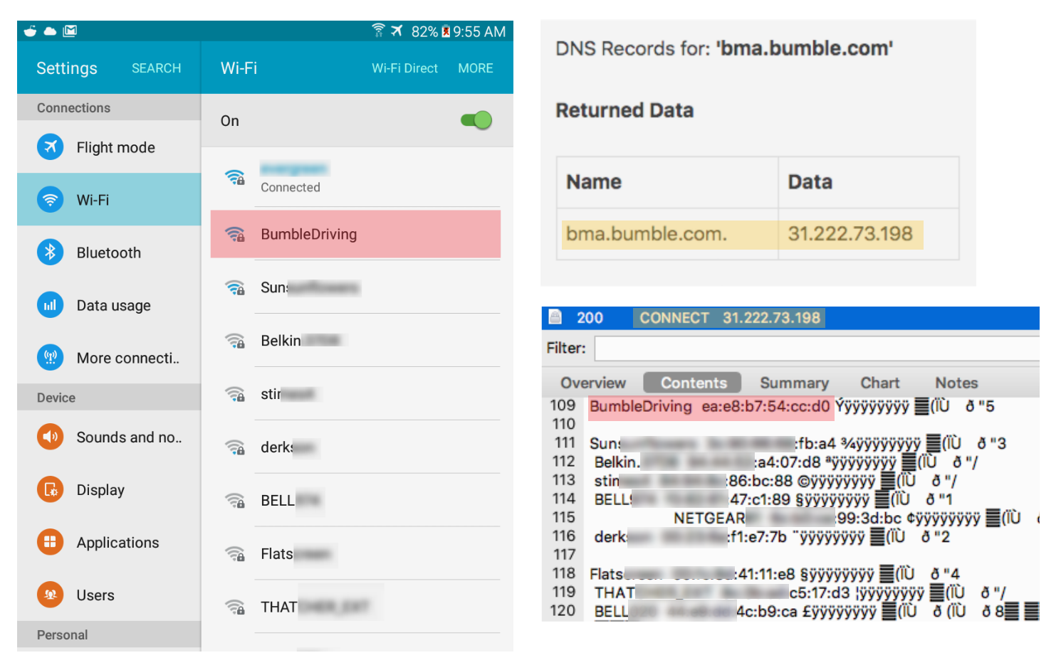 Bumble is practicing a form of distributed war driving via their Android Application. This is potentially to detect fraudulent accounts as any device which has strange network configurations may indicate suspicious activity. The amount of access point data which they collect from their users would rival that of similar large scale WiFi access point mapping services such as WiGLE.