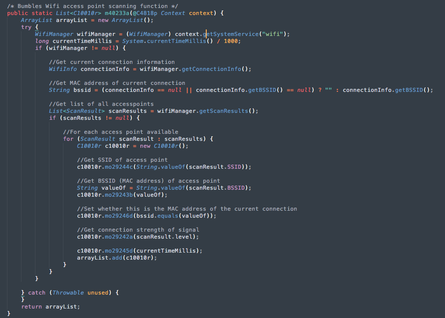 From the decompiled APK the WiFi scanning code was found. This code shows that Bumble is capturing the SSID, BSSID (MAC address), and the strength of the signal of each available WiFi access point. In order to get this WiFi information the App is required to ask for the ACCESS_FINE_LOCATION permission and with that is able to determine as precise a GPS location as possible. This results in Bumble having highly precise geographic access point data.