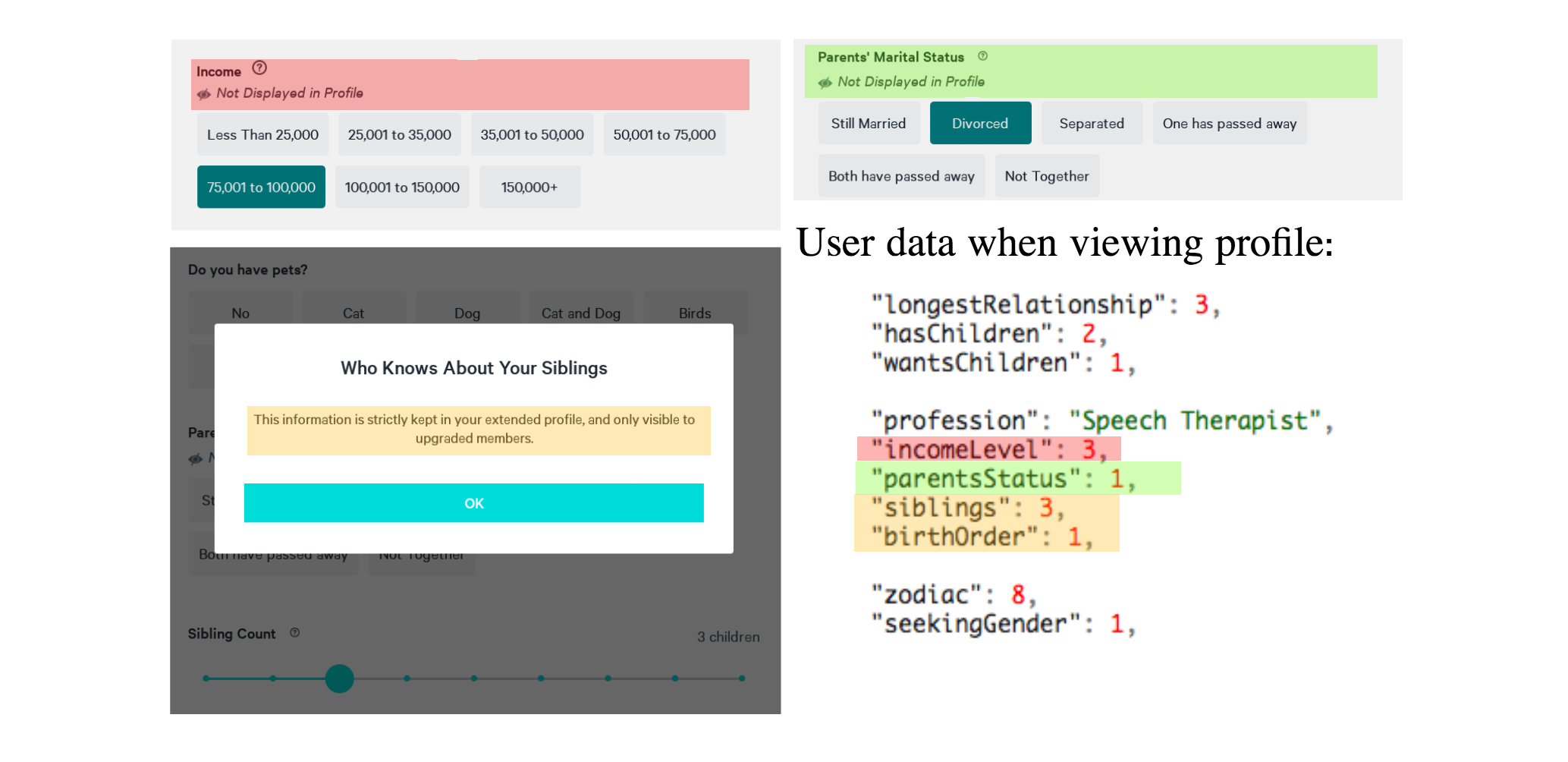 When registering Plenty of Fish states that they won't display certain information about the user such as their income level, marital status of their parents, or number of siblings. Although Plenty of Fish indeed does not display this information on a user’s profile, it is still accessible to any viewer of their profile via the API.