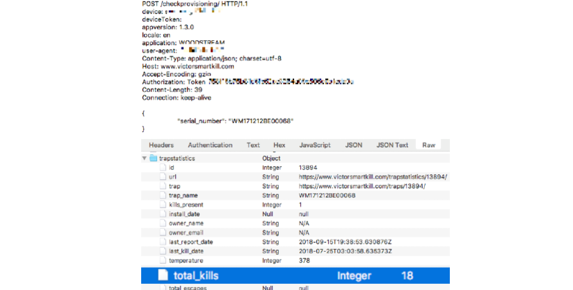 Surveying the mouse traps with serial numbers adjacent to the one seen in the unboxing video, the second type of response was observed. This response contained information such as the number of total kills, owner name, owner email, Wi-Fi SSID, lat/long, and more. While surveying the data, the fields which contained sensitive information such as emails and names were observed not to be filled in, however this was on a small sample set of 200 mouse traps using a python script.